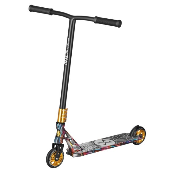 Model wyróżnia się dopracowaną stylistyką i wykończeniem. Bazą jest matowa czerń kierownicy T-bar oraz pozostałych elementów, którą przełamują złote akcenty - przede wszystkim zacisk oraz aluminiowe rdzenie kół. Minimalistyczna kierownica w układzie T-bar podkreśla sportowy, „czysty" look, a ryflowane uchwyty TPE zapewniają pewny chwyt i lepszą kontrolę podczas trików. Widelec i krawędzie decku zdobi dynamiczna, wielobarwna grafika w formie „smug" (m.in. odcienie niebieskiego, różu, czerwieni i fioletu), dzięki czemu hulajnoga wygląda energicznie nawet w bezruchu. Na górze decku dominuje grafitowo-szary motyw pajęczyny z centralnym znakiem, natomiast spód podkreśla mocny, kontrastowy motyw pająka, który nadaje całości charakteru. Takie połączenie kontrastów i przenikających się barw buduje nowoczesny, „animowany" vibe inspirowany street artem i komiksową energią.