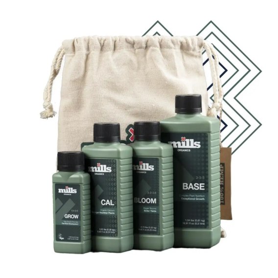 • Mills Organics Base (500 ml): Kompleksowa mieszanka mikro- i makroelementów, dostarczająca roślinom energii niezbędnej do prawidłowego wzrostu przez cały cykl życia.