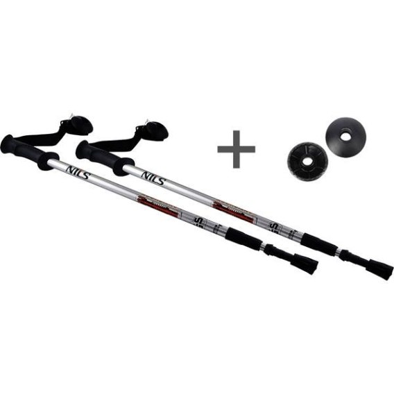 W zestawie znajdują się również, talerzyki do kijów trekkingowych i nordic walking. Talerzyki zapobiegają zbyt głębokiemu wbijaniu się kijków w miękkie, grząskie podłoża. Model TN103 Nils idealnie sprawdzi się podczas marszu na podłożu miękkim takim jak błoto czy piasek.